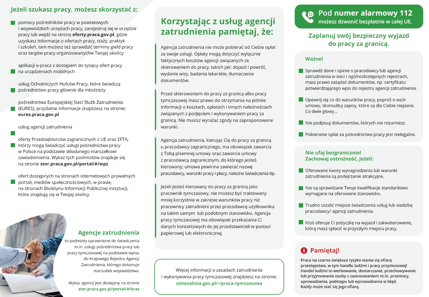 Poradnik opracowany przez Ministerstwo Rozwoju, Pracy i Technologii dotyczy bezpiecznych wyjazdów Polaków do pracy za granicą. Kluczowym punktem jest ostrzeżenie przed nielegalnymi pośrednikami pracy oraz potrzeba dokładnego sprawdzenia ofert i umów przed podjęciem decyzji o wyjeździe.